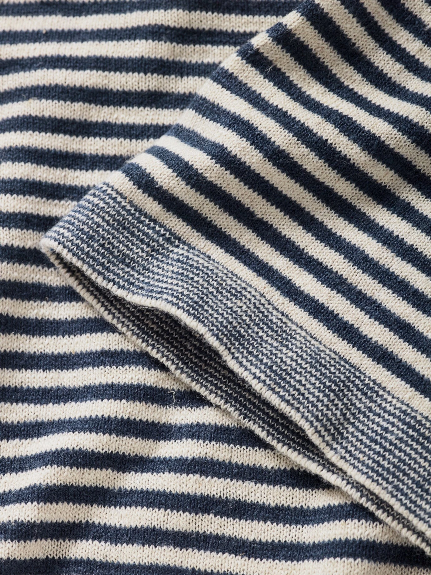 Eigentlich zu schade für drunter. So ist dieses Shirt vom Ursprung her allerdings designt, um es unterm gleichnamigen Cardigan zu tragen (Nr. 23-4565). Der feine Ringel macht sich aber auch gut unterm Sakko oder direkt solo. Grund dafür: der feine Baumwollstrick (in Südeuropa schwören sie auf diese Art von T-Shirts im Sommer) gepaart mit einem Drittel Leinen. Entweder dann stilvoll zur Anzughose kombinieren, das T-Shirt entwickelt sich aber auch gut an heißen Tagen zu luftigen Jeans.