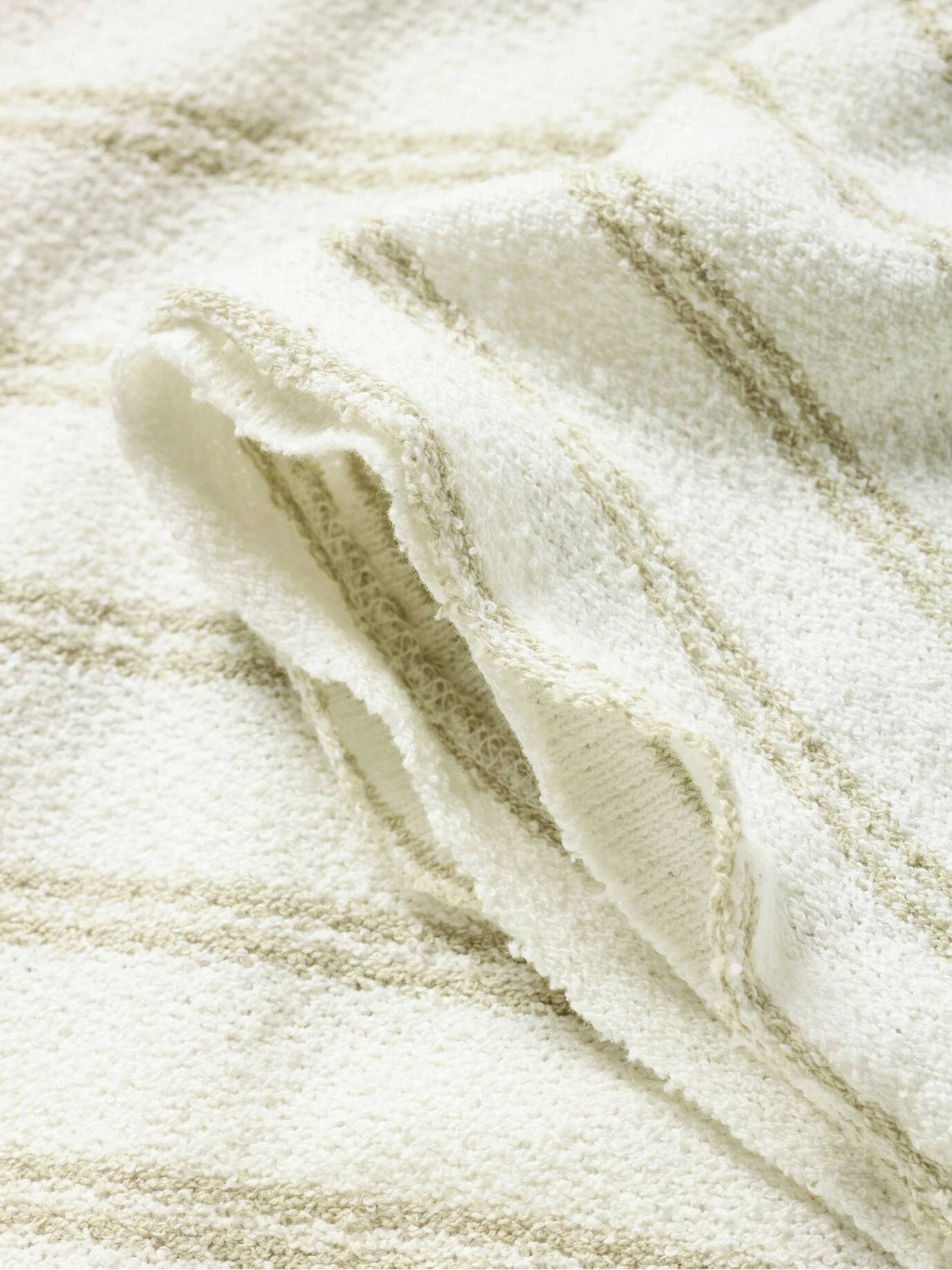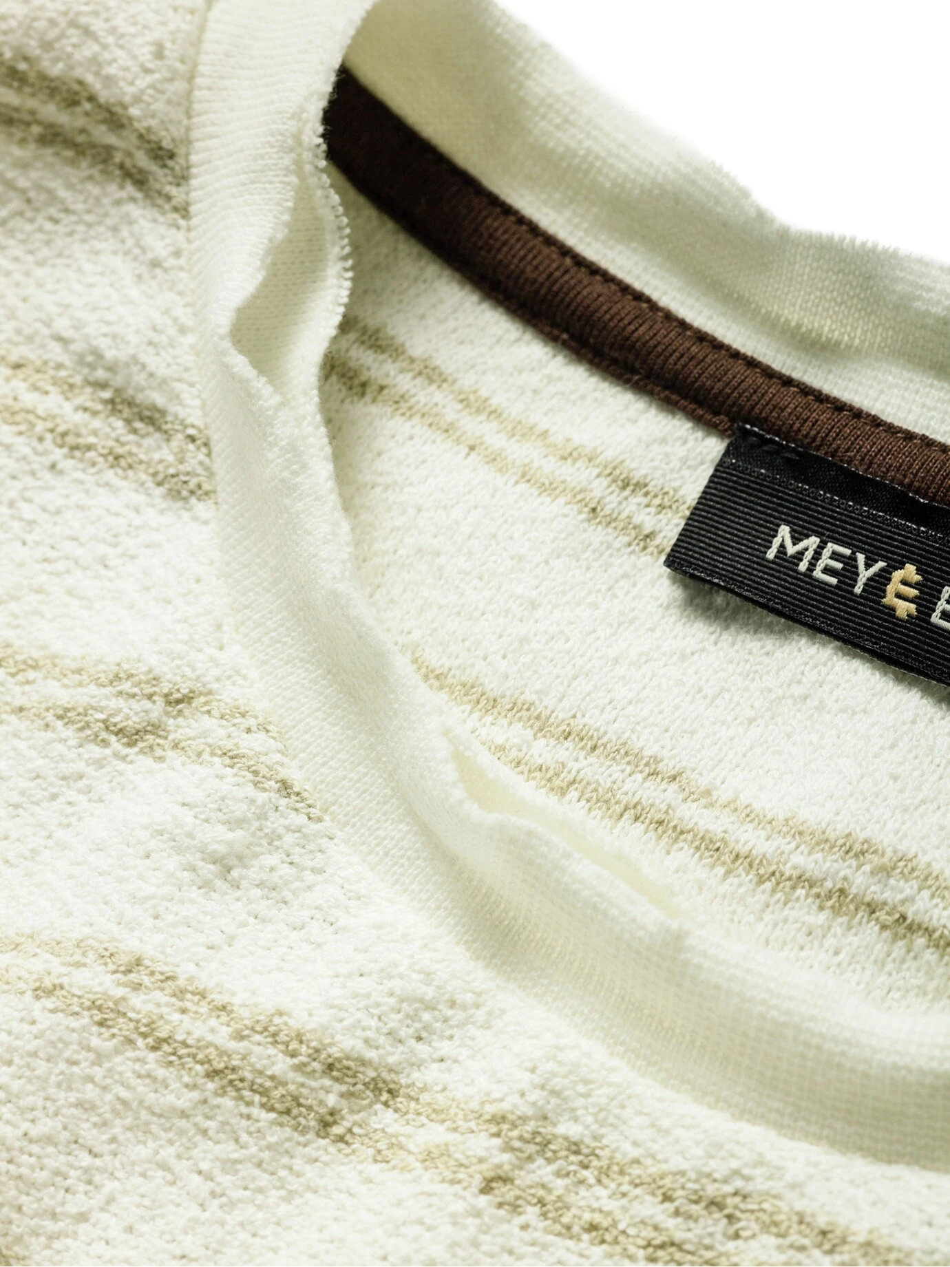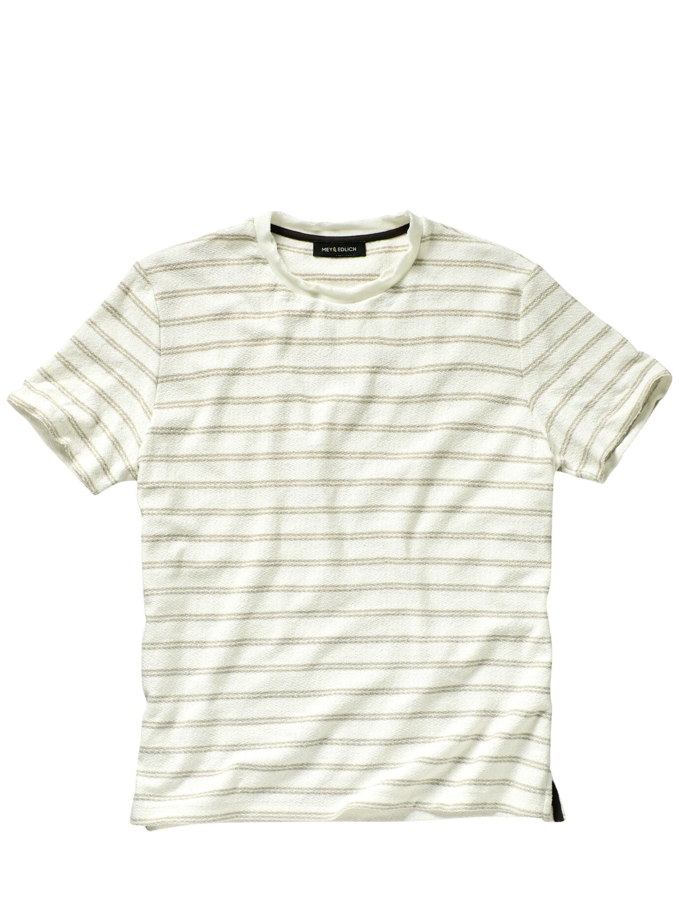 Vorgeknittert in Bestform. Das Baumwollgarn dieses Shirts ist gelockt, beinahe borstig, so avanciert es zum Brett im Shirtregal, es ist die Spur fester als Bekanntes. So liegt es nie komplett auf der Haut, wenn, ergeben sich kleine Luftpolster zum Klimaaustausch. Modisch natürlich mit offenen Kanten, damit das Streifenmuster genug Präsenz hat, kommt es ohne die obligatorische Brusttasche aus.
