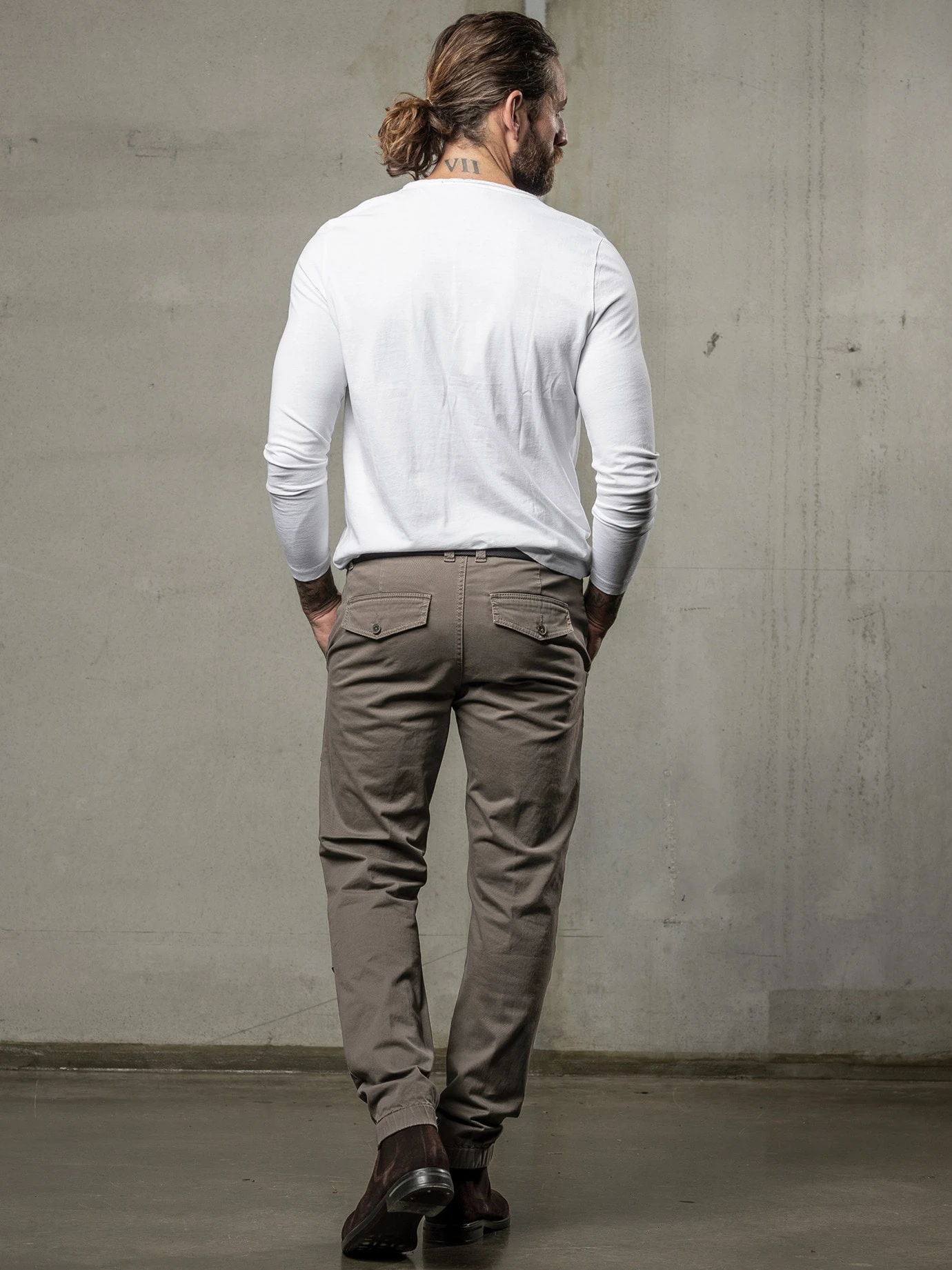 Verarbeitung: Zwei Paspeltaschen vorne, zwei Pattentaschen hinten. Bündchen. Regular Fit.