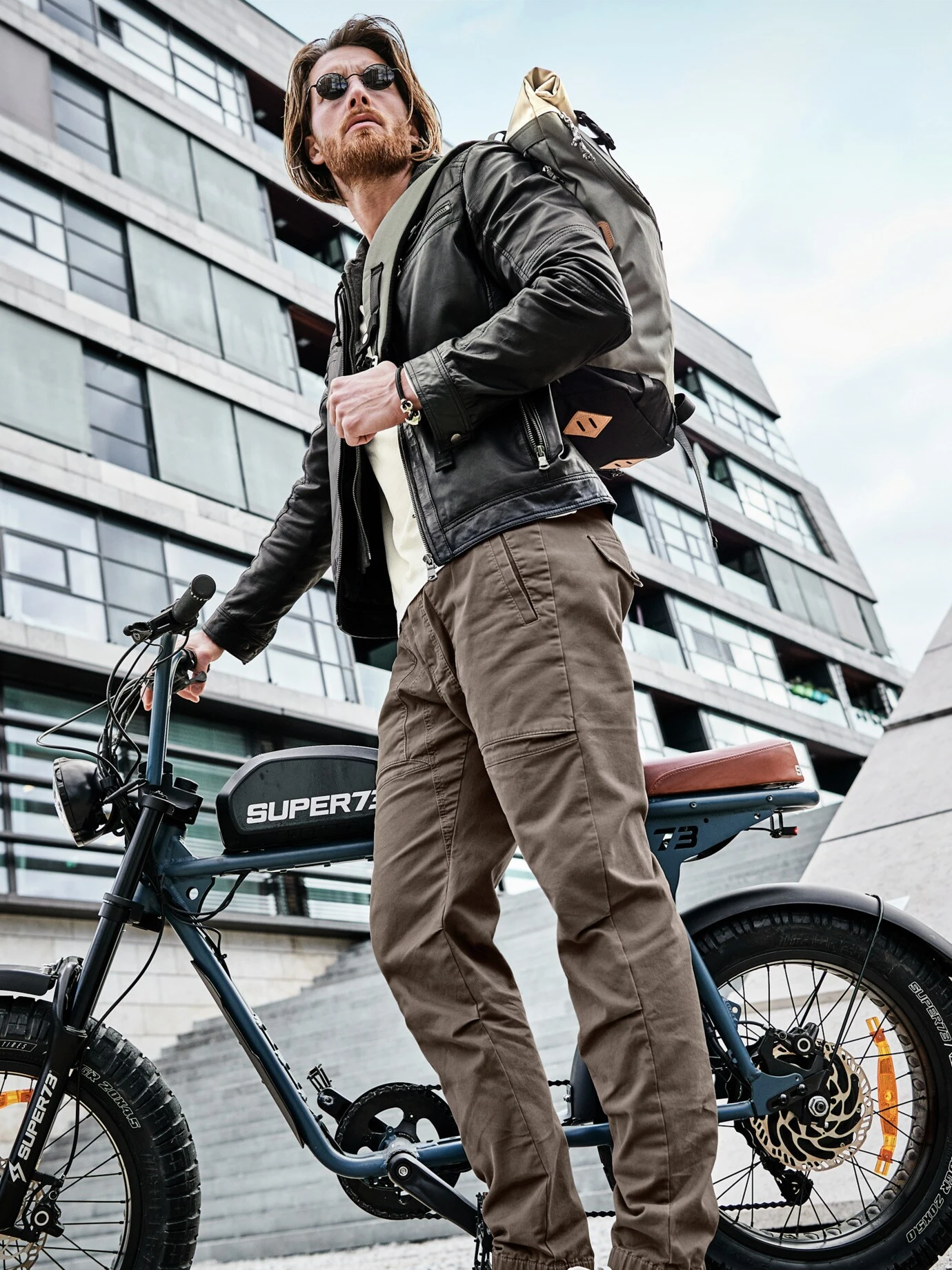 Elektrifiziert bis ins Bündchen. Die Cuttings an den Knien hat sie sich von den Bikerhosen abgeschaut, die einst dem Schutz dienten und heute für coole Optik sorgen. Die Baumwolle liegt weich auf der Haut, der Anteil Elasthan sorgt auf dem E-Bike für Tretfreiheit. Aerodynamische Bündchen sorgen dafür, dass die Hose im Fahrtwind weder flattert noch sich in der Kette verfängt. Aus den extragroßen Taschen rutscht auch in der Bewegung nichts raus. Sportlich mit Sweater und Lederjacke, beim Außentermin mit Hemd und Weste. Sneaker gehen immer.
