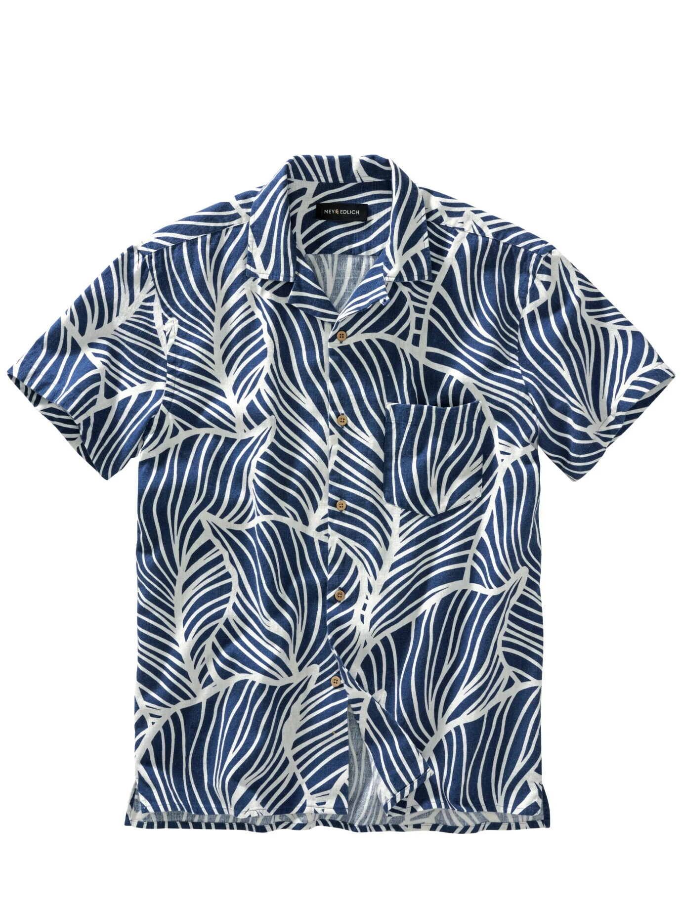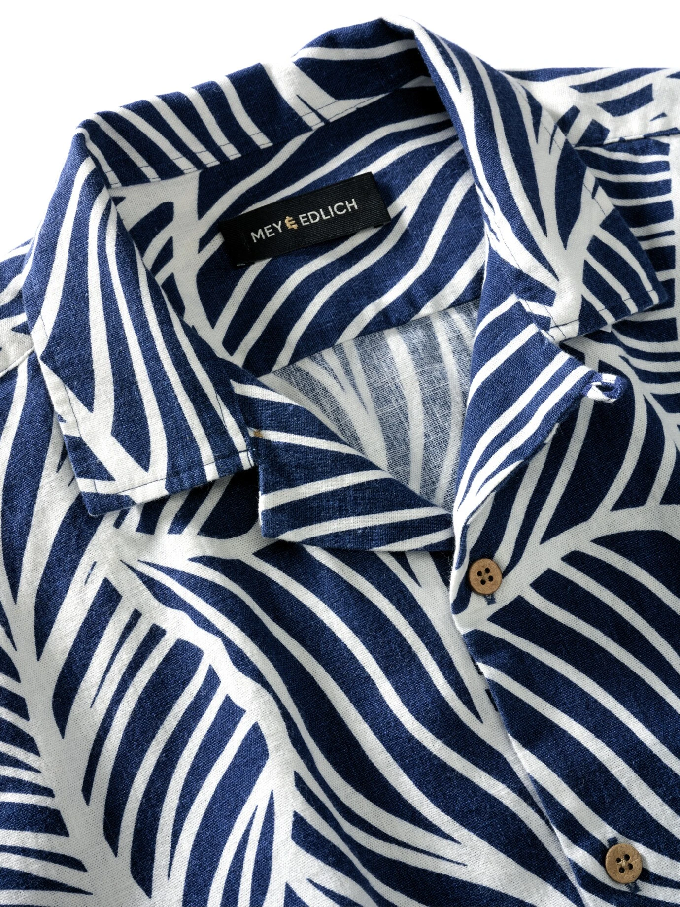 Grafische Kunst. Viel Farbe, viel Form und doch steht dieses Hemd in keiner Konkurrenz zu den sonst meist bunten Hawaiihemden. Das Hemd selbst ist aus robustem Leinen gewebt, mit gewohnt körniger Struktur. Gepaart mit Baumwolle, damit der Stoff länger glatt bleibt. Der kunstvolle Druck stammt aus der Hand des türkischen Fachmanns für bedruckte Hemdenstoffe.