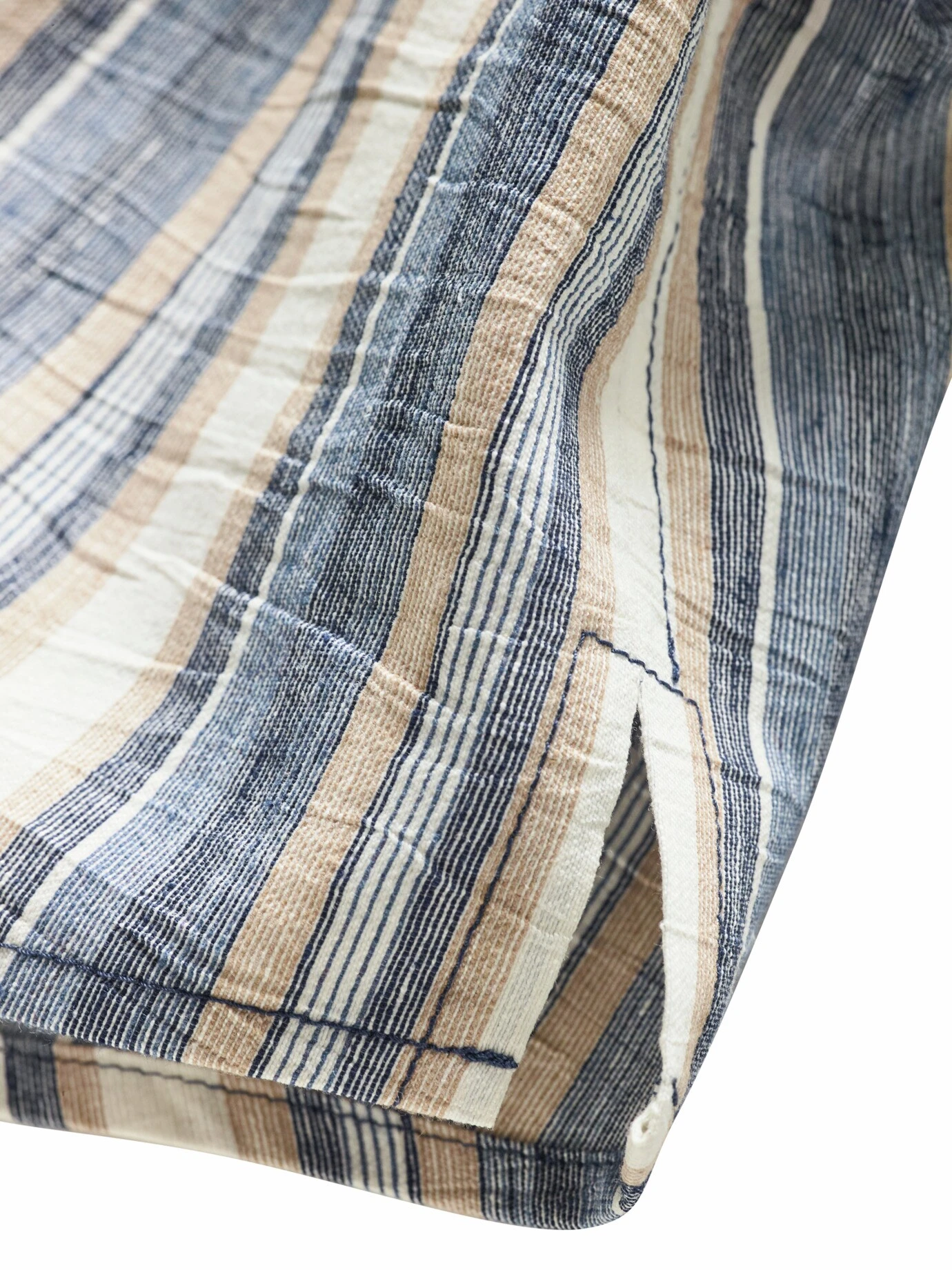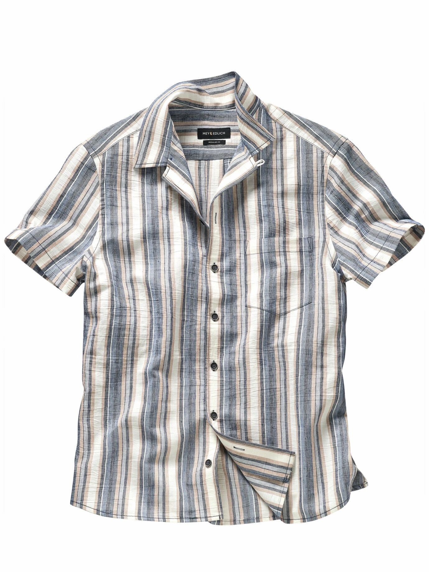 Gegensätzliche Kräfte am Werk. Aufrechte Streifenverläufe, sorgfältig eingewoben, sorgen hier für Ordnung. Gleichzeitig halten horizontale Knittereffekte vehement dagegen und lassen auf einen potenziell ungebügelten Stil schließen. Beides zusammen schafft genau die Spannung, aus der Charakter entsteht (und nie gebügelt werden muss). Passt zu Sommertagen, an denen nicht alles regelkonform sein muss. Und dann am besten zu Jeans und Ledersandalen oder Chino mit Sneakern.