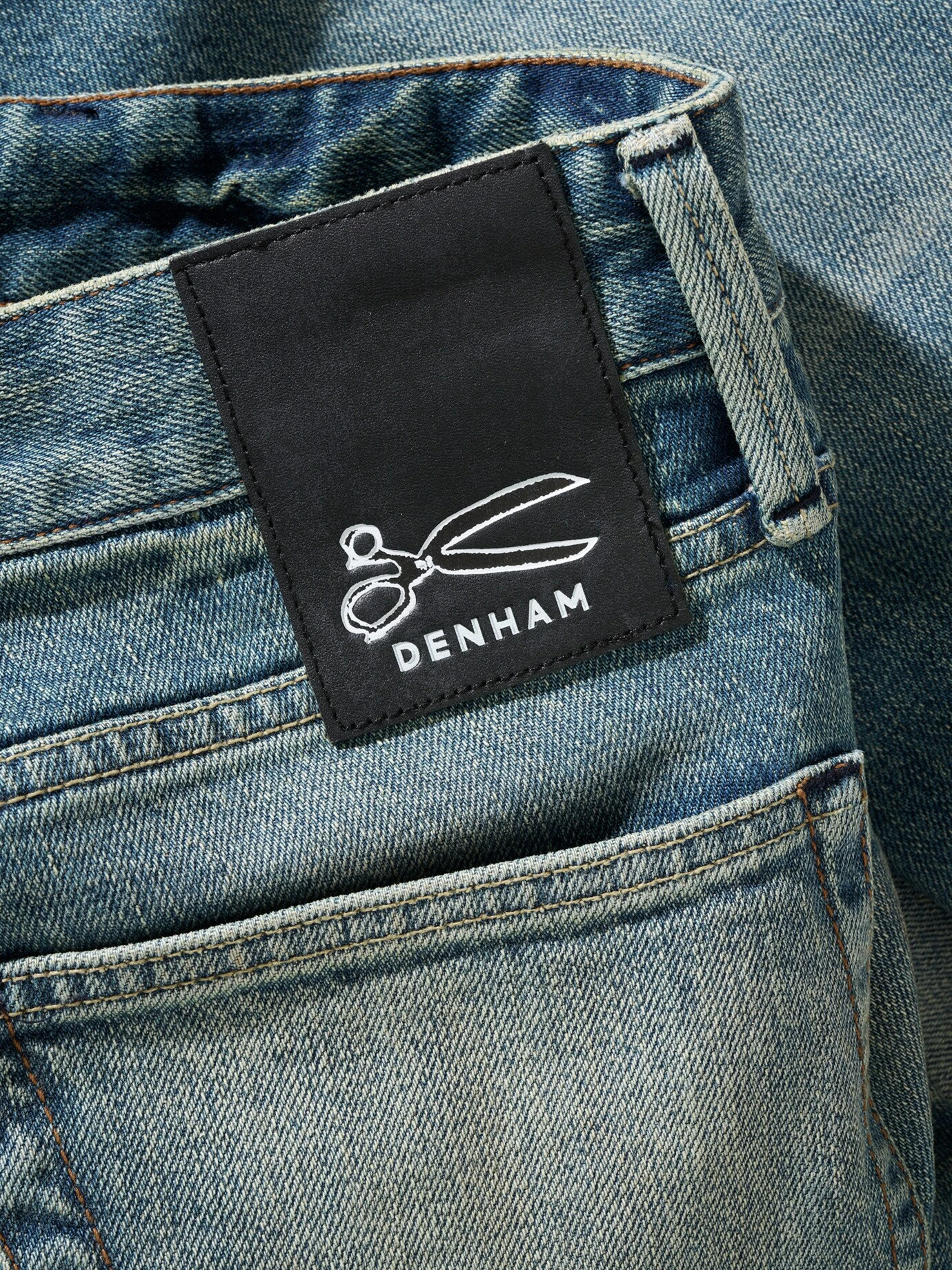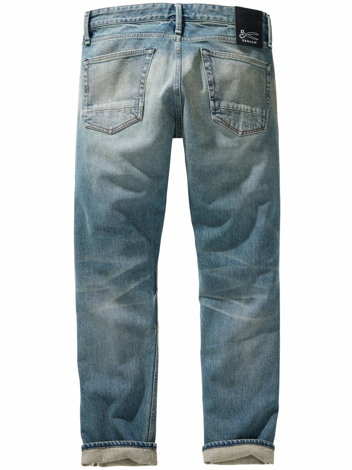 Mit 691 Stichen wird das Scheren-Logo auf eine DENHAM gestickt. Seit er in den 70er-Jahren seine erste Schneiderschere gekauft hat, ist Jason Denham von Jeans besessen. 2.000 Scheren und ein Label in Amsterdam später hat er Stoffe, Schnitte und Waschrezepturen zur Perfektion getrieben. Hier mit einer leicht grünlichen Waschung, die der Jeans die richtige Patina verleiht. Die Spur Elasthan macht den Denim merklich dehnbarer, der etwas lockerere, gerade Schnitt ist nach vielen Jeans-Jahren noch so bequem wie am ersten Tag.