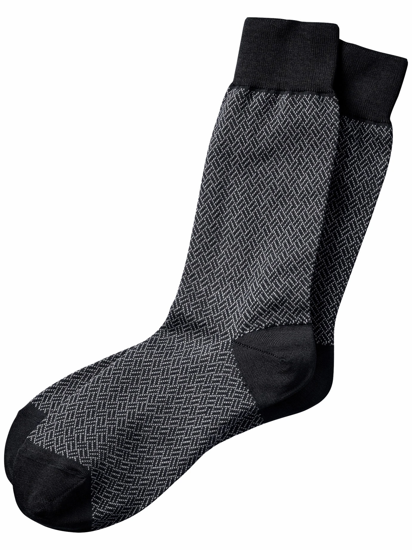 Geheimnisträger. Auf den ersten Blick ist sie eine gemusterte Socke. Auf den zweiten ein kleines Kunstwerk mit einem zweifarbigen Jacquardmuster, das auf speziellen Strickmaschinen gefertigt wird und für die eindrucksvolle, atmungsaktive Struktur sorgt. Gefertigt aus edler, merzerisierter Baumwolle, die sie robust und reißfest macht, und einer Portion Hightech-Garn für die Form- und Pflegebeständigkeit, freut sich ihr Fuß über eine besonders weiche Socke mit feinem Glanz, die zu Anzughose wie Jeans passt.