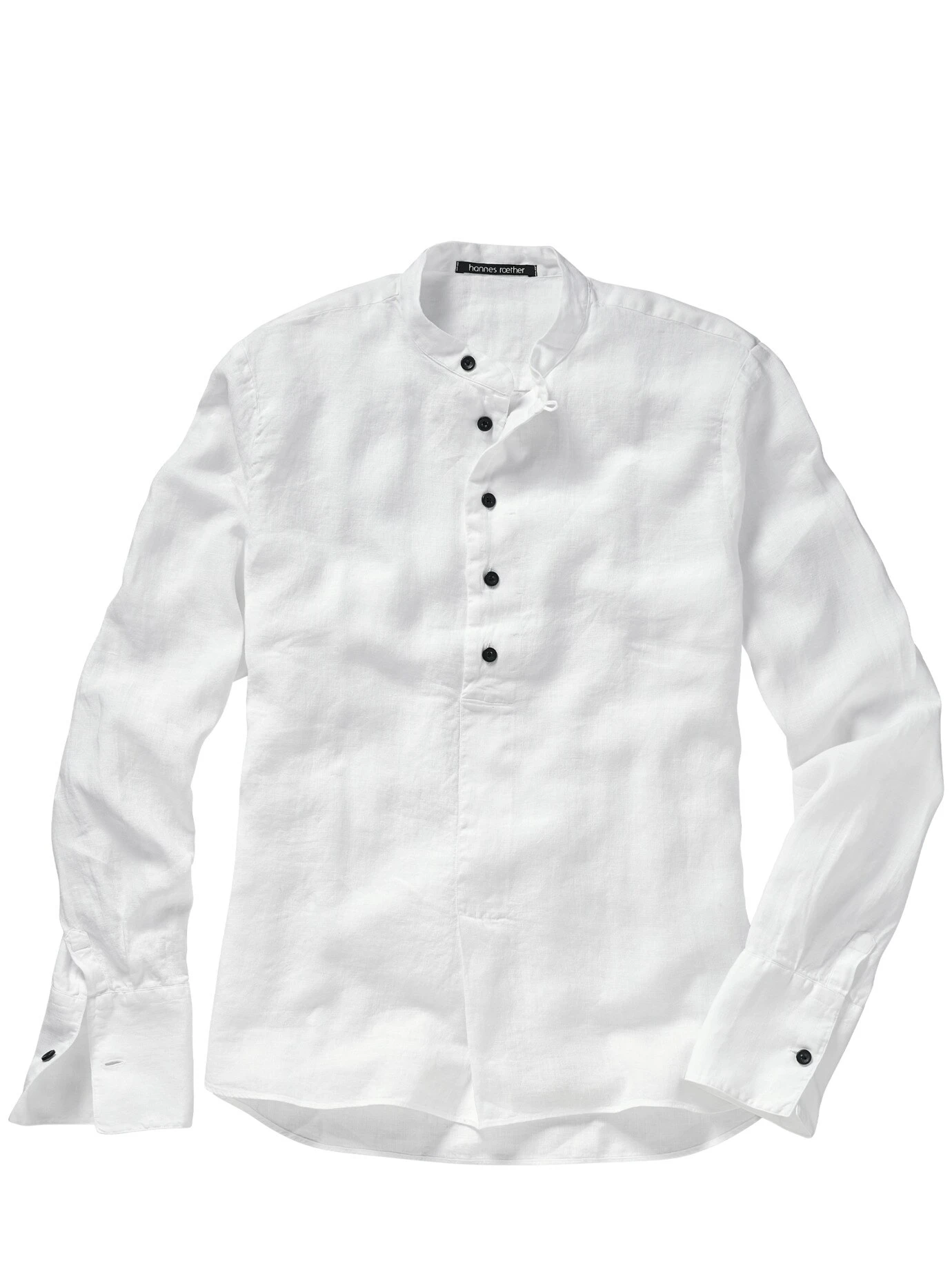 Leinenhemd mit Arbeiterästhetik. In diesem Hemd verarbeitet hannes roether gekonnt die Ursprünge des Hemdes. Geschätzt von den Männern, die vom Ertrag ihrer Hände Arbeit leben, kragenlos, dafür mit Knopfleiste und lockerem Schnitt, damit drin geschuftet werden kann. Neu ist sein unbeschriebenes Weiß und die gelebten, typischen Leinenknitter, dieses Maß Unbekümmertheit bei Hitze stammt aus Portugal. Dort würden sie das Hemd monochrom zu weißer Hose kombinieren, roether empfiehlt dunkle Hosen.