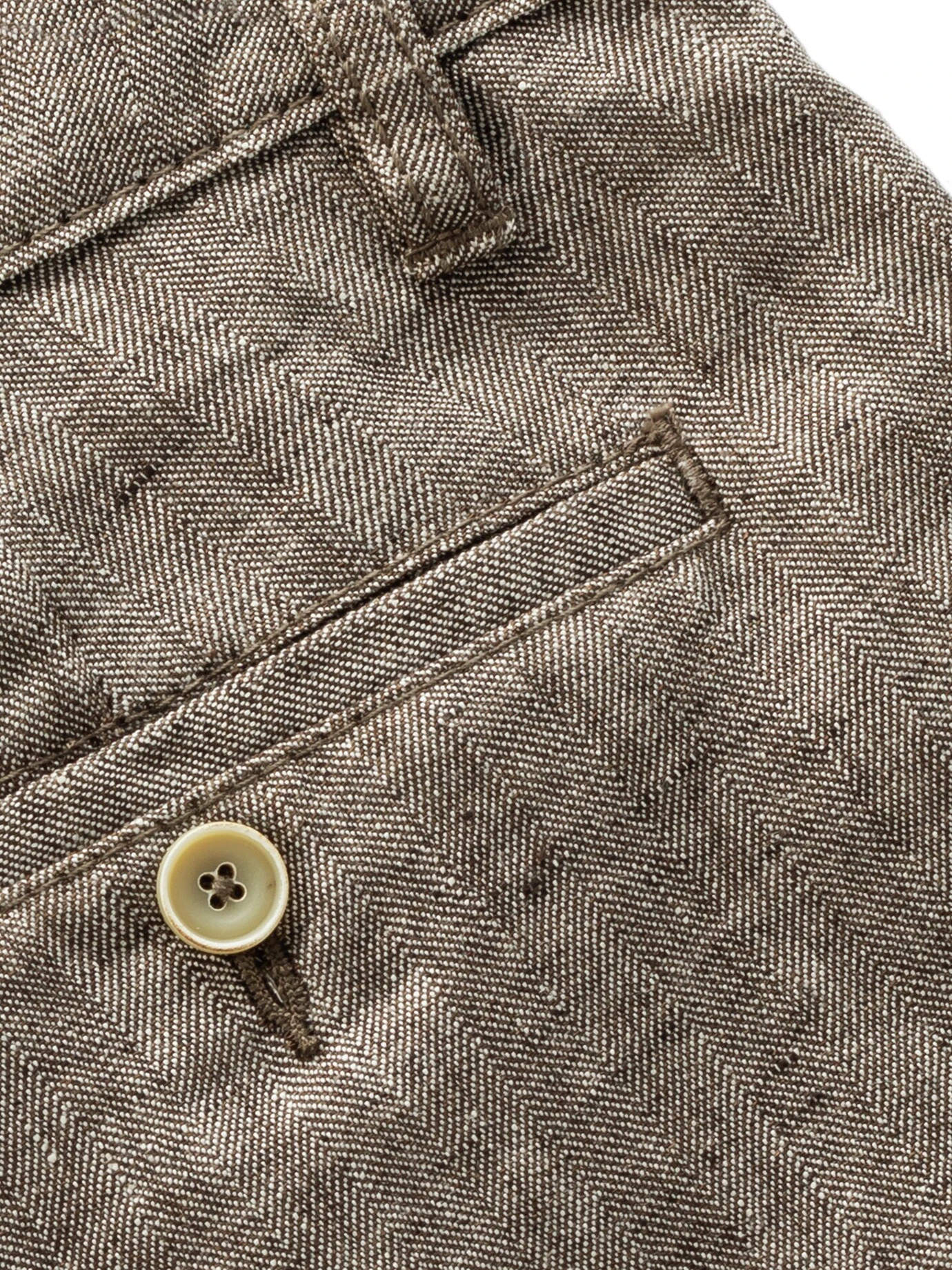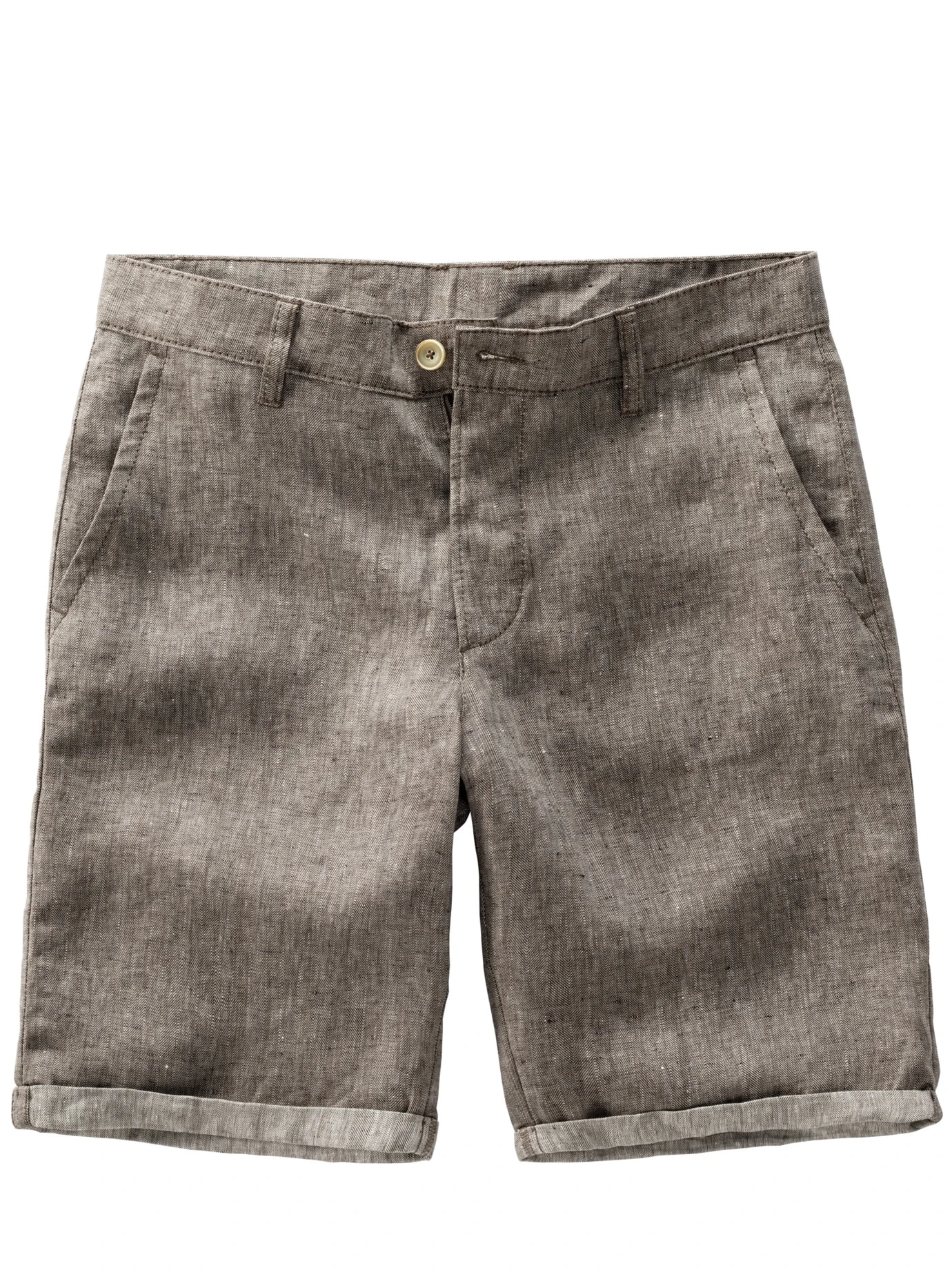 Bei Hitze unbezwingbar. Nichts kühlt besser als Leinen – auch bei Shorts. Der etwas steife Stoff steht immer ein wenig ab und wirkt dadurch wie ein Blasebalg, der bei Bewegung Luft zufächelt. In Italien dann als Fischgrat gewebt, was die leichte Hose noch strapazierfähiger macht: Sollte sich mal ein Fleck verirren, geht er in der Struktur unter. Die natürlichen Knitter und das locker sitzende Bein (mit vorab fixiertem Umschlag) unterstreichen den lässigen Look, der viele schöne Sommeroutfits ergibt.