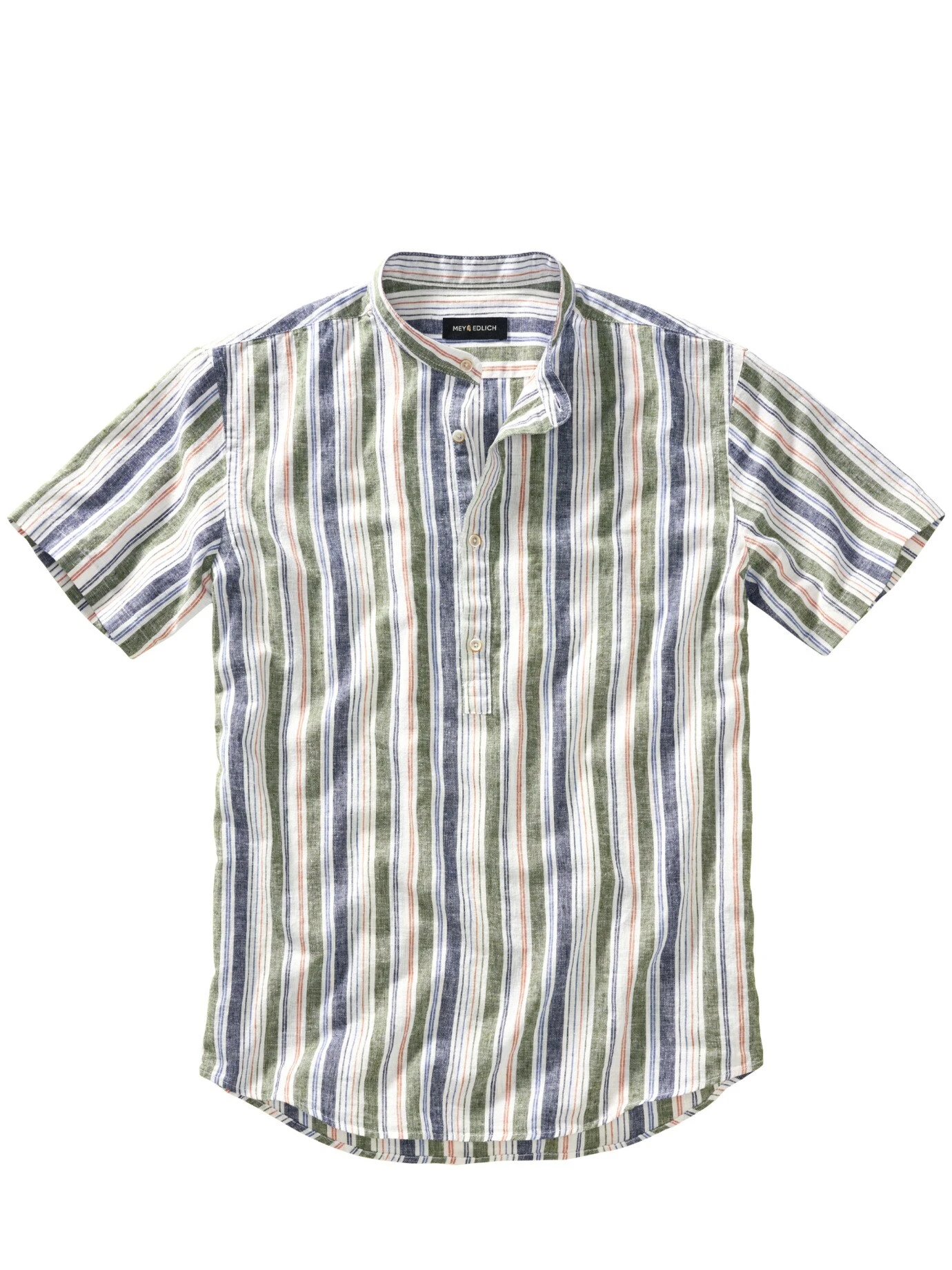 Gut wie damals. Vom Ursprung ein Schlupfhemd, wie es früher die Männer bei harter Arbeit bevorzugten, da es schnell über den Kopf gezogen war und genug Platz zum Werkeln ließ. Heute trägt es einen anliegenden, kurzen Ärmel, den neuen Maßstab setzt der Stoff: Viel Leinen macht es bei Hitze unschlagbar, die Baumwolle lässt Sie drunter frisch aussehen (schlägt nur sanfte Knitter). Mit hochwertig eingewebtem Streifen, der beim Weben zwar Zeit veranschlagt, farblich aber beeindruckt.