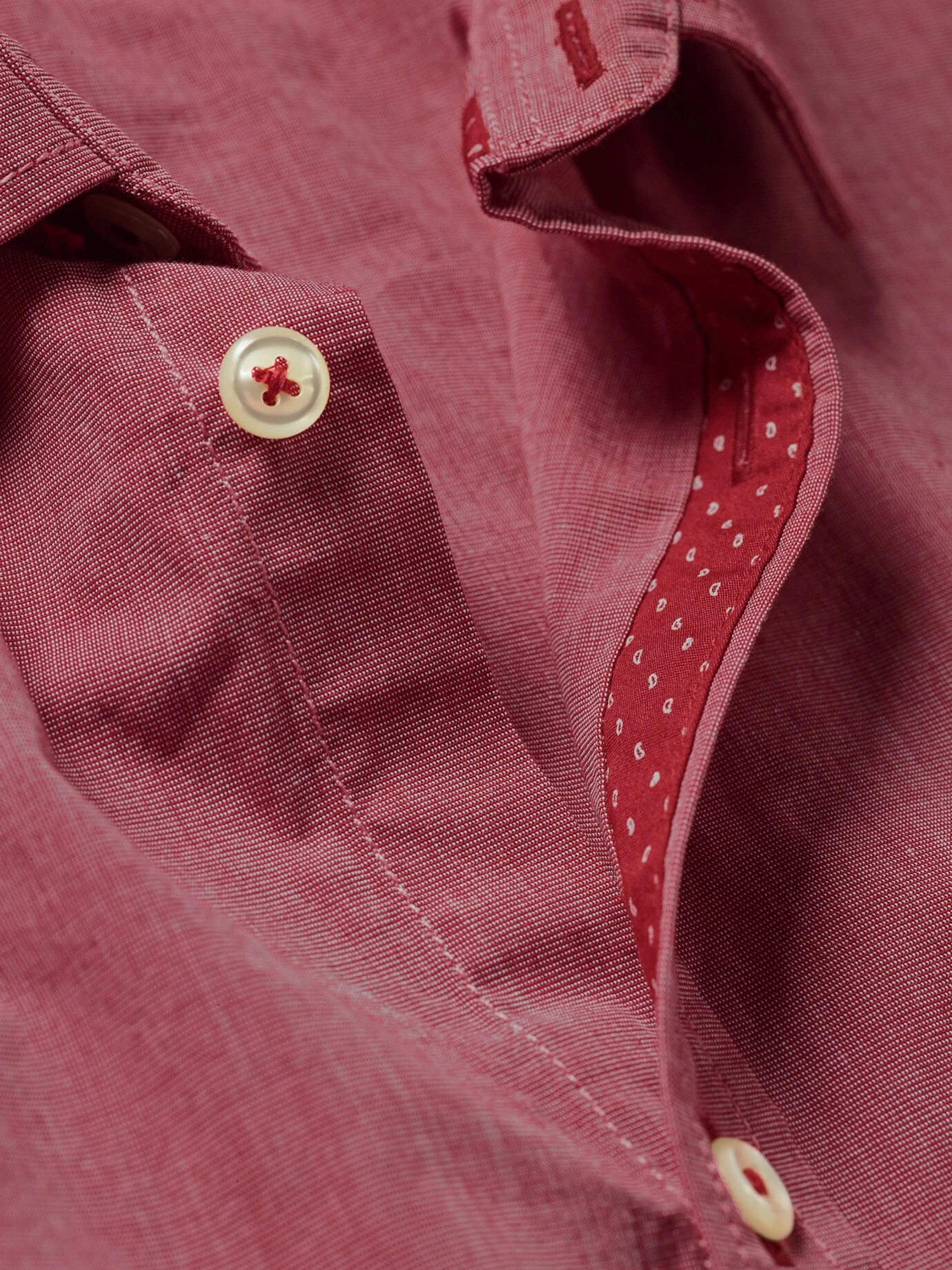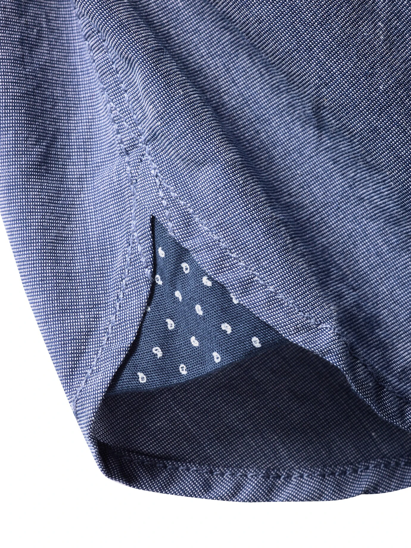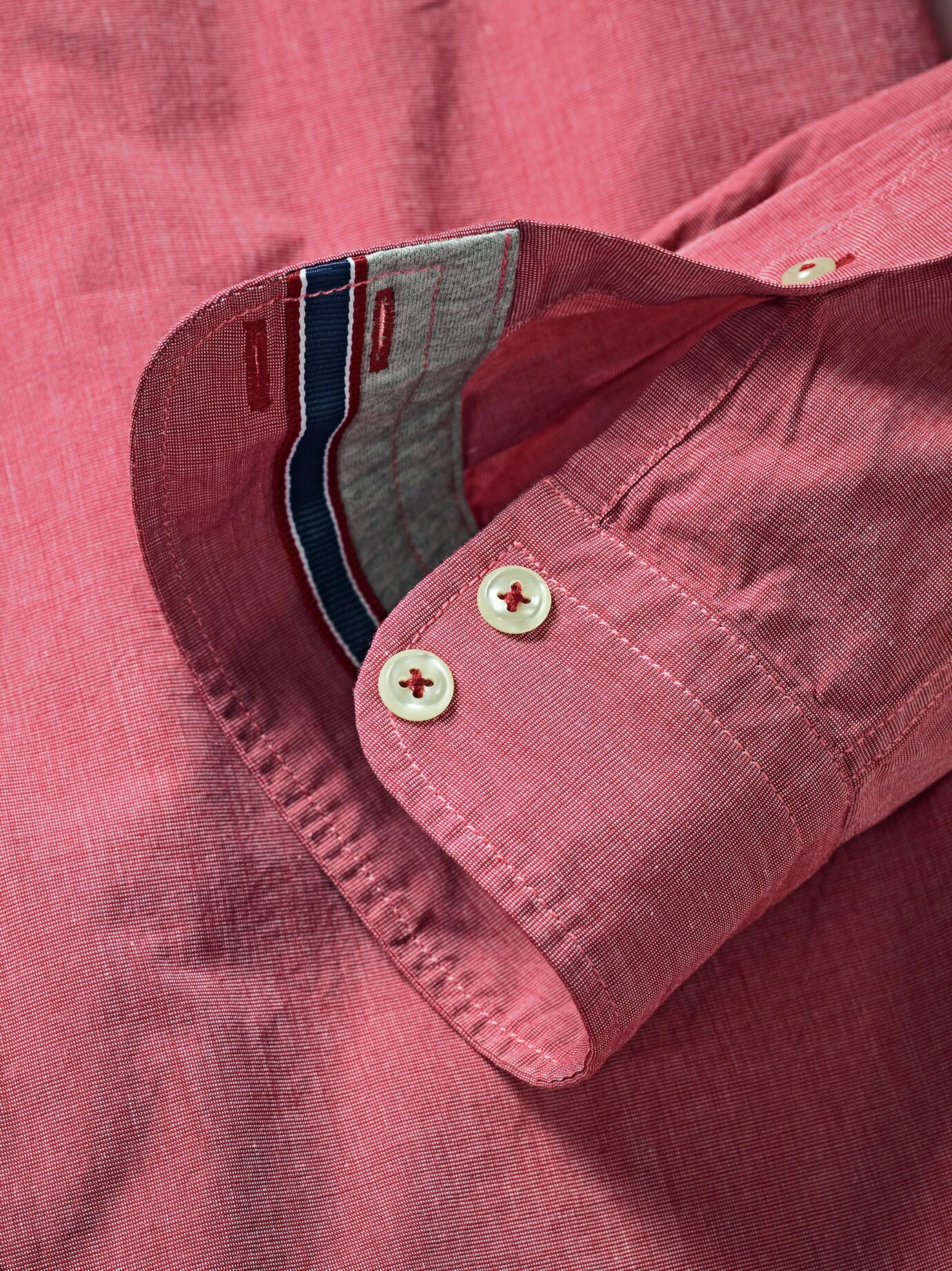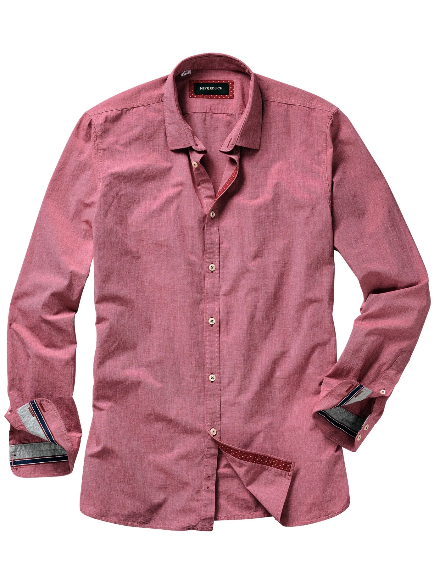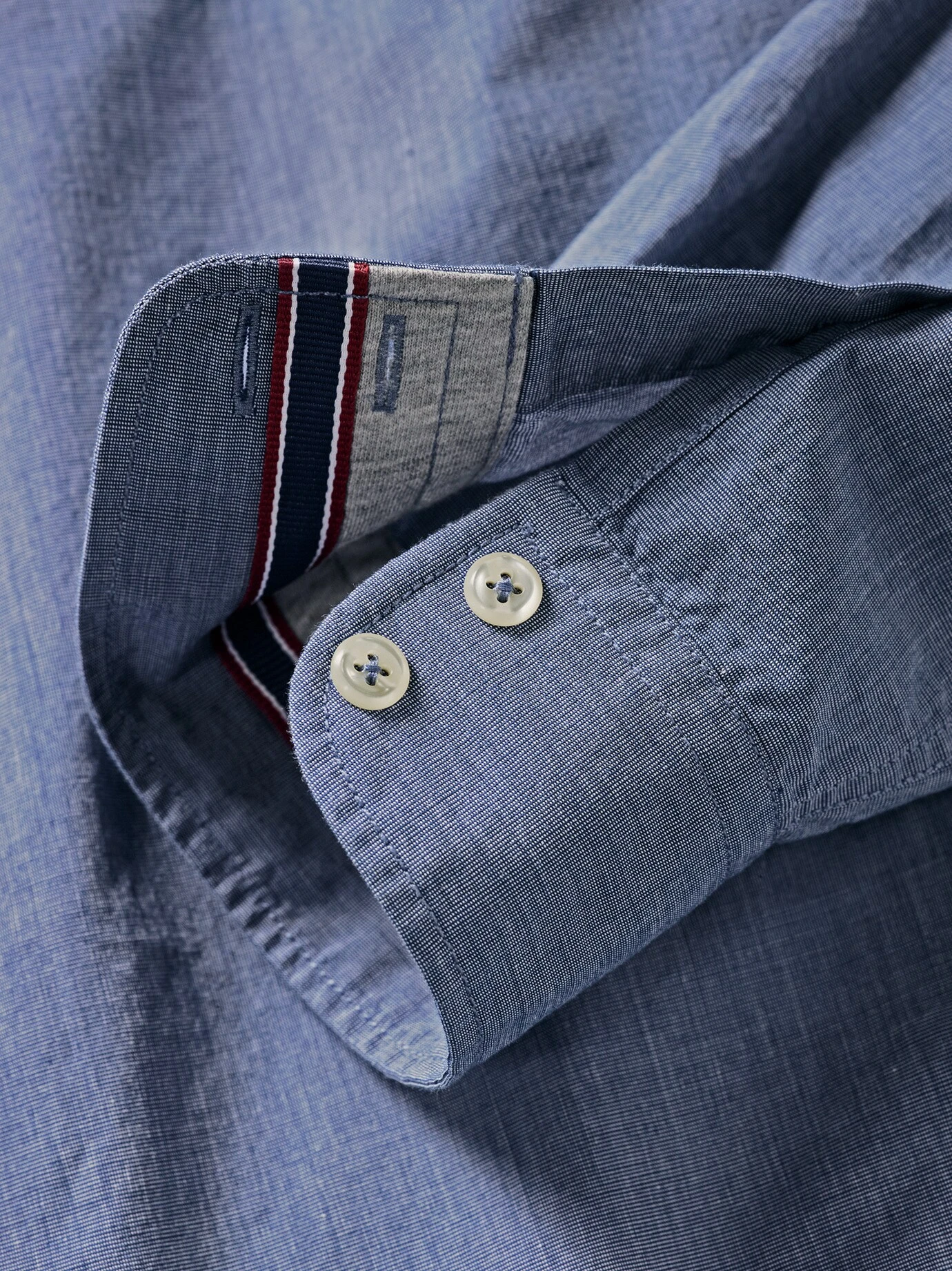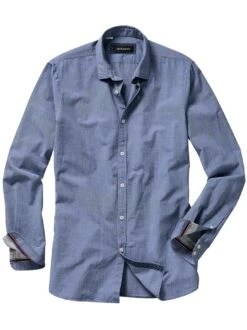 Material: Je nach Lichteinfall changiert es durch den feinen Chambray interessant. Schöner Besatzstoff an den unteren Hemdecken, schön daher auch über der Hose. Kentkragen. Aufgesetzte Knopfleiste. 2-Knopf-Manschetten (nicht verstellbar). 100 % Baumwolle. Waschmaschinenfest.