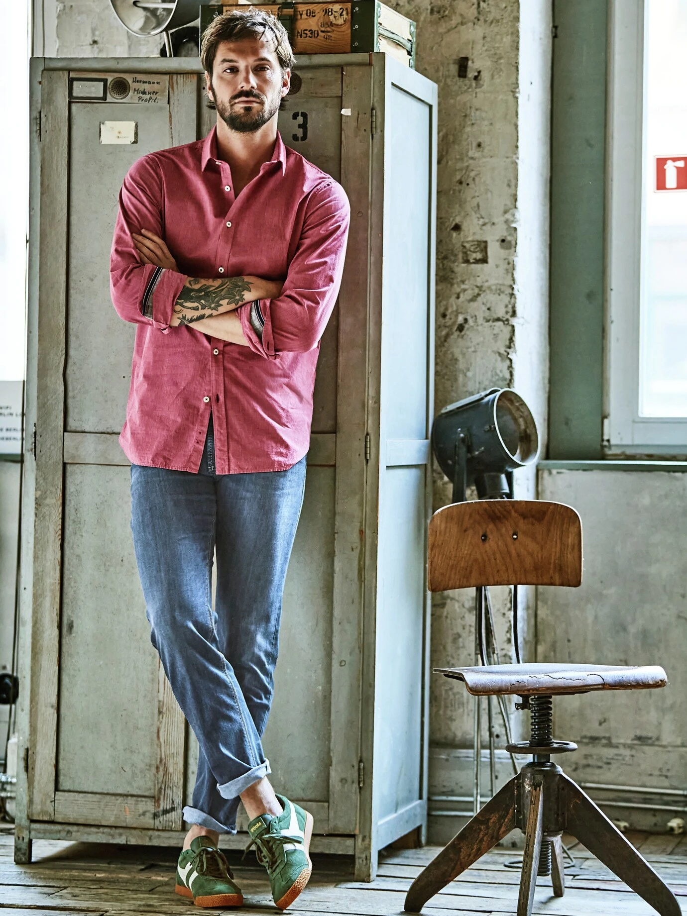 Bereit, wenn Sie es sind. Dieses Hemd passt sich per Knopf Ihrem Umfeld an. Cool aber simpel: Ganz intuitiv werden Sie die Ärmel krempeln, um den Besatzstoff hervorblitzen zu lassen, der an alte Collegejacken erinnert. Kommt dem Denken-Genießen-Feiern-Modus zugute. Zusätzlich verfügt es über smarte Details, die entdeckt werden wollen. Einmal angezogen trägt es sich sehr angenehm, der fein gewebte Baumwollstoff liegt gut an und ist durch und durch garngefärbt, damit Sie lange Freude daran haben. Entweder dann lässig über der Hose tragen, wirkt aber auch im Bund einer Jeans.