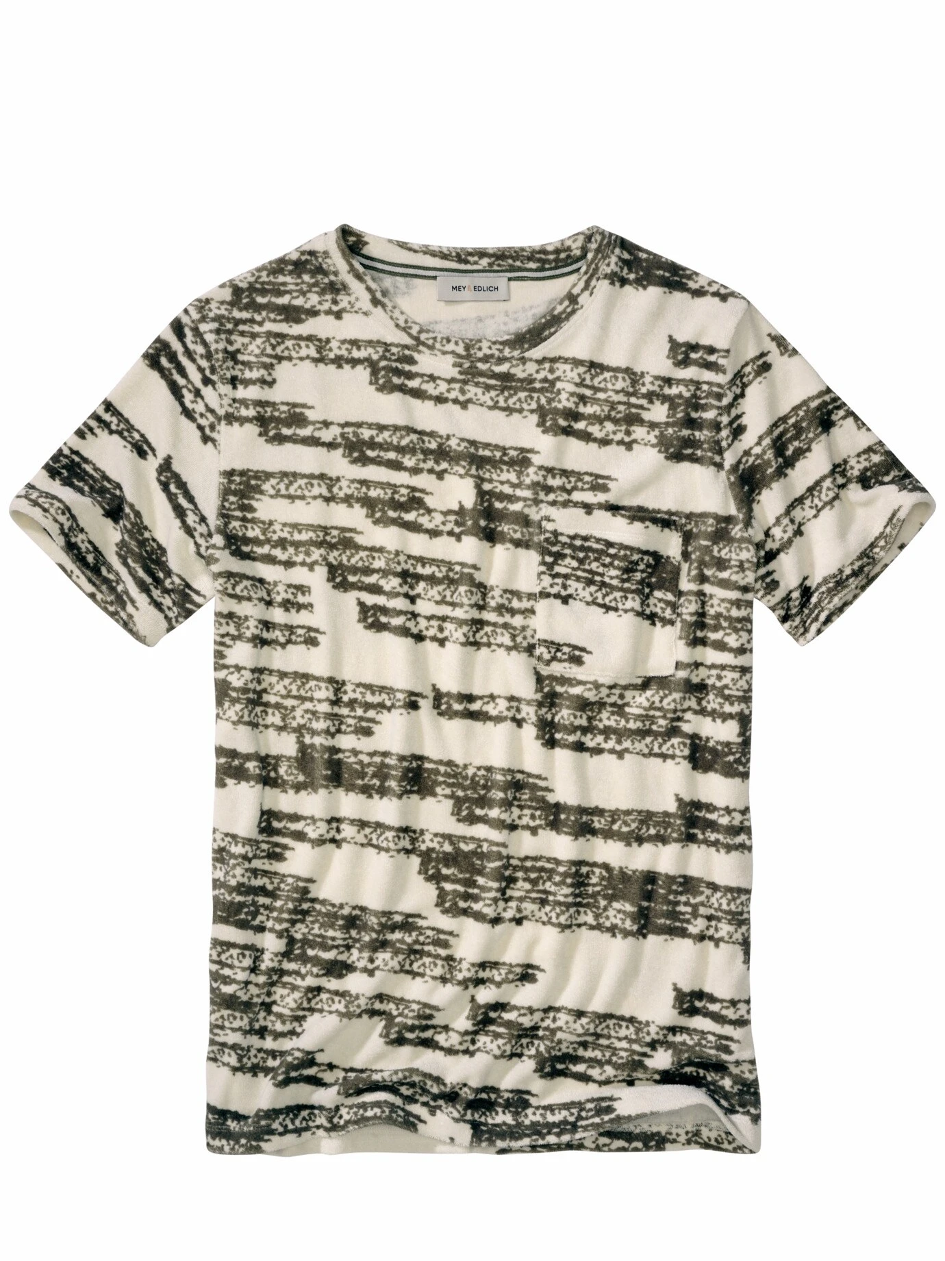 Leichter als das Erinnerte. Frottee ist ein Charakterstoff für Shirts und Sweatshirts. Nun kommt er etwas leichter und sommerlicher: Mit 220 Gramm ist das Shirt solide, dicker als ein T-Shirt, aber nicht so schwer wie ein Handtuch. Die typischen Schlaufen (French Terry) trägt das Shirt außen. Weil viele das Raue des Frottees nur bedingt mögen, ist es innen glatt. Die körnige Struktur ist schmutzunempfindlich. Dazu passt alles, was entspannt und entspannt aussieht, z. B. eine Cargo, Shorts, Leinenhose.