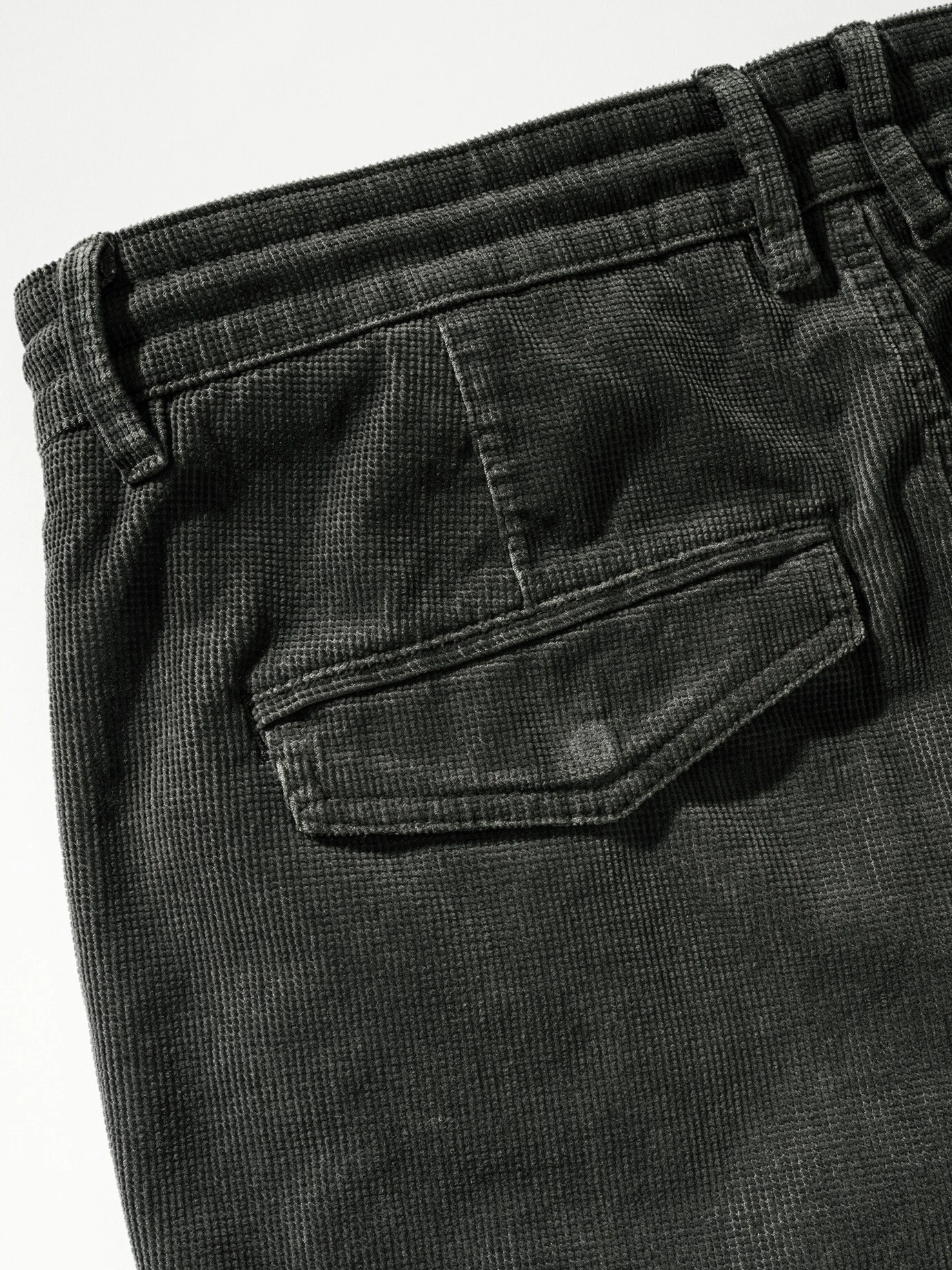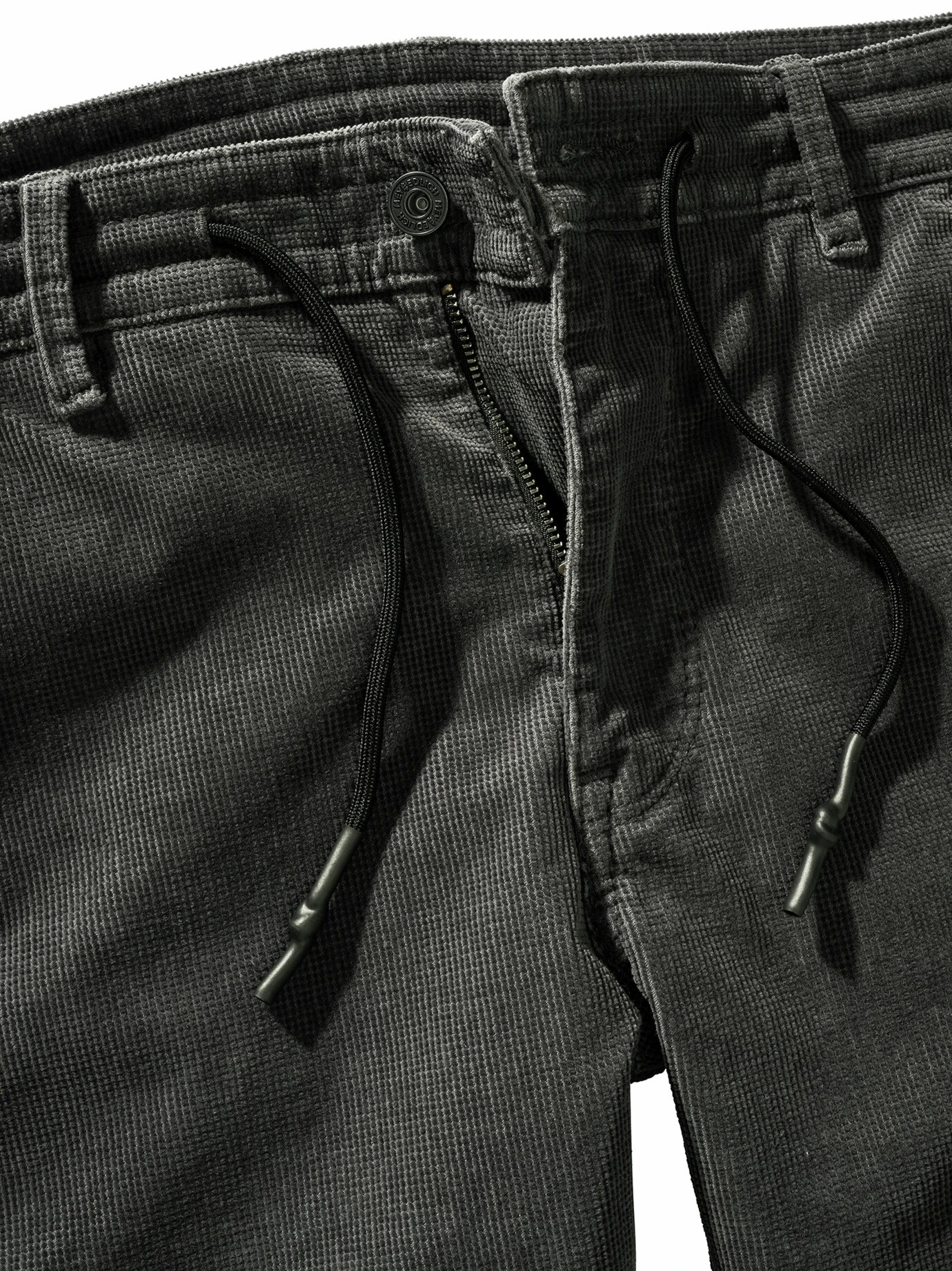 Auf der Suche nach Struktur? Struktur ist wichtig, diese Hose trägt sie. Statt an glatt erinnert sie an Cord. Aber nicht in seinen klassischen Bahnen, sondern mit quadratischen Noppen. Dass sie sich in Summe bequem trägt, liegt am Elasthan, darauf zahlt zusätzlich der Tunnelzug ein. Die Cuttings verleihen, angezogen, Dynamik.