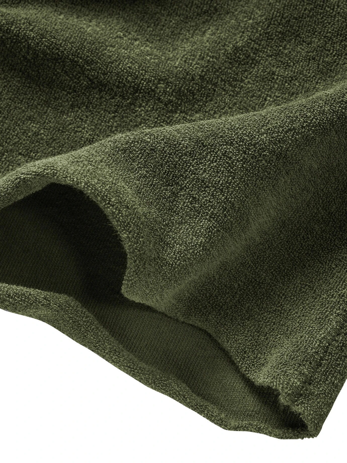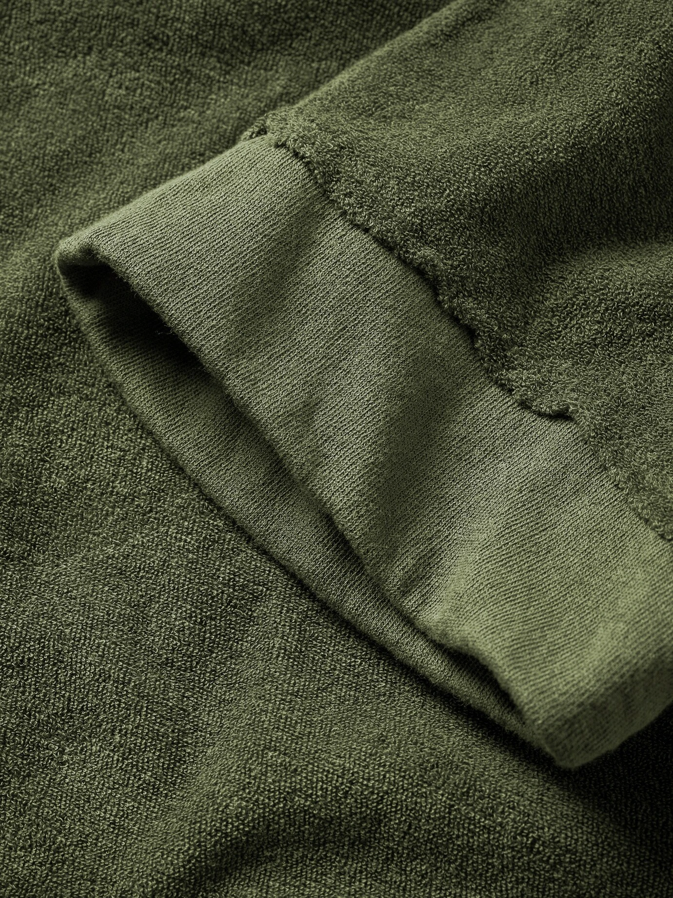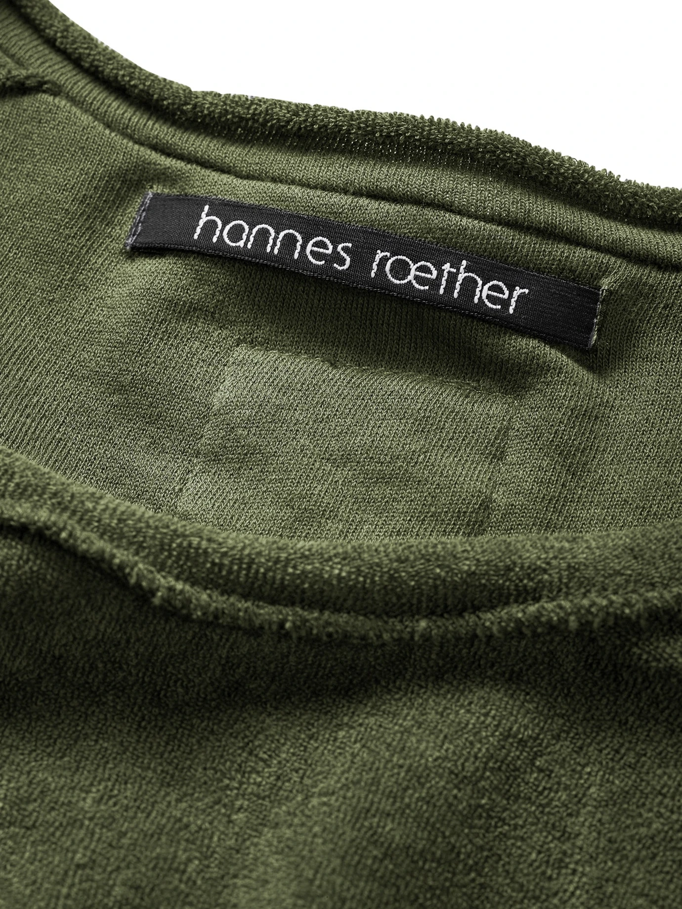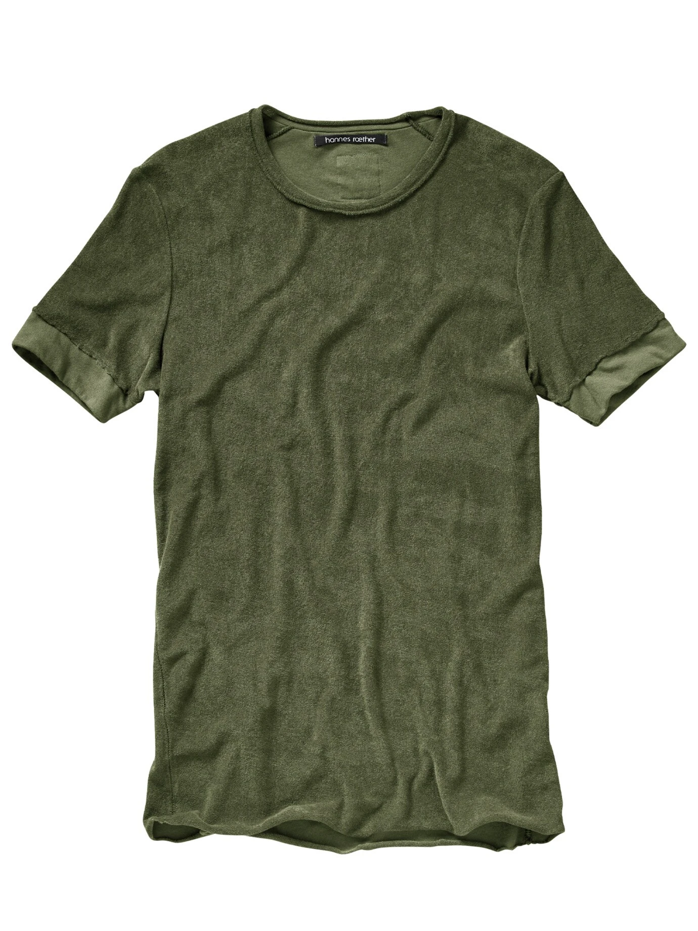 Mit Tiefenwirkung. Fest reiht sich außen Schlinge an Schlinge aneinander. Frottee ist zurück. hannes roether denkt den Stoff neu und das Shirt damit betont lässig. Ersterer stammt aus Portugal, der Frottee wird auf links gedreht, innen trägt er sich fein. Ideal für den Übergang – das Shirt kühlt und wärmt zugleich – je nach Bedarf, meist reicht schon ein Cardigan drüber.