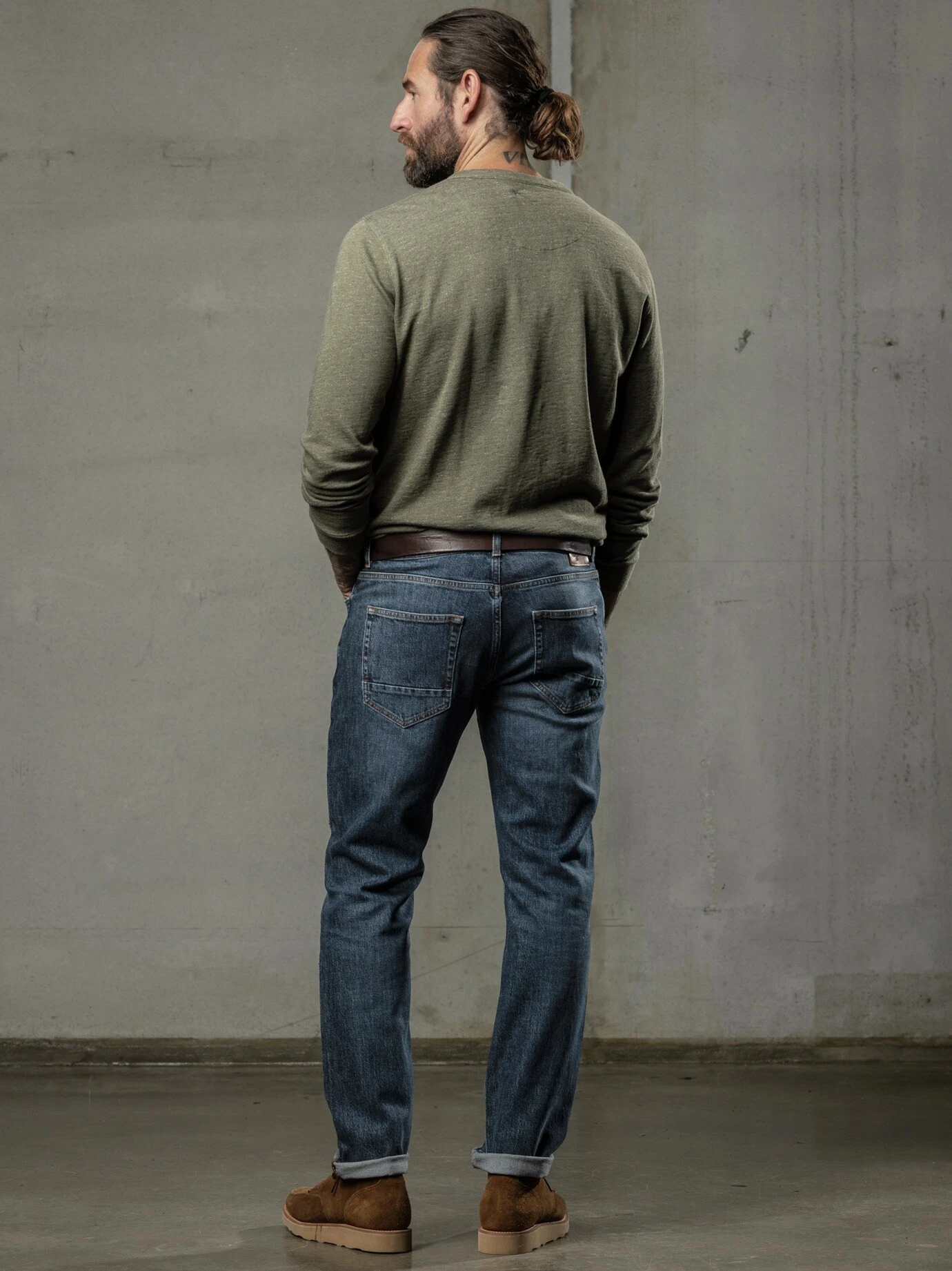 Die etwas nachhaltigere Jeans. Sie ist klassisch, so wie sie Männergenerationen schätzen. Doch der robuste 14-oz-Denim ist auf moderne Weise gefertigt. Aus Bio-Baumwolle und anschließend mit einer wassersparenden Methode gefärbt. Die Waschung ist authentisch used und macht die Jeans wandelbar. Moderner Schnitt: oben lässig, zur Wade hin schmaler (daher tut auch das Elasthan ganz gut).