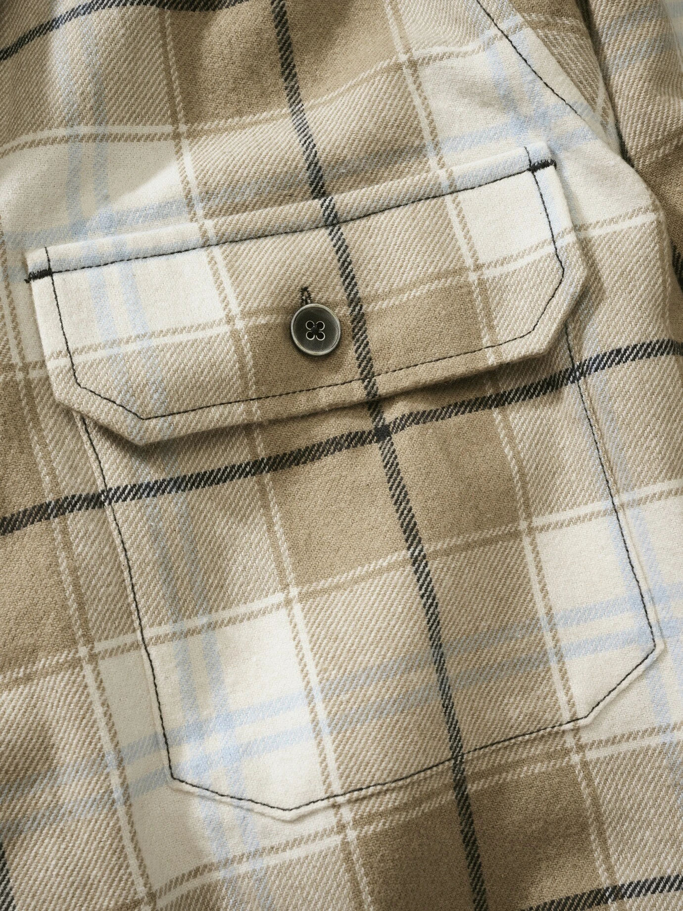 Eine energetisierende Wirkung geht von den großen, cleanen Karos auf dem kastigen, gerade geschnittenen Hemd aus. Die helle Farbgebung und der weiche, aber dichte Baumwollflanell tun ihr Übriges. Praktisch sind die großen aufgesetzten Brusttaschen und pragmatisch die dunkel abgesetzten Knöpfe, die sich nicht nur mit Schwielen an den Händen gut greifen lassen. Als hätten Sie es schon ein paar Mal getragen, tatsächlich wird der Flanell dafür leicht vorgewaschen. Ungezwungen als normales Hemd über der Jeans, unbezwingbar als Jackenersatz mit Shirt oder Turtleneck drunter.