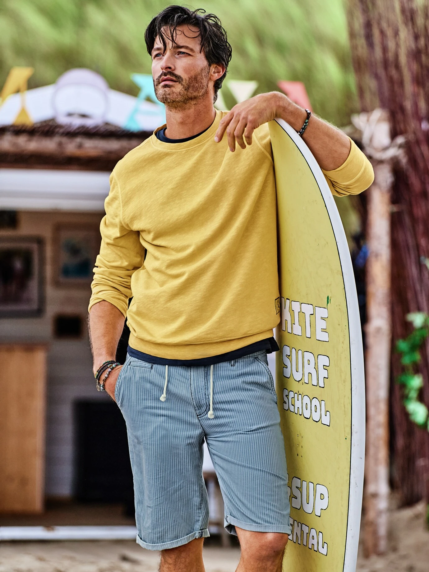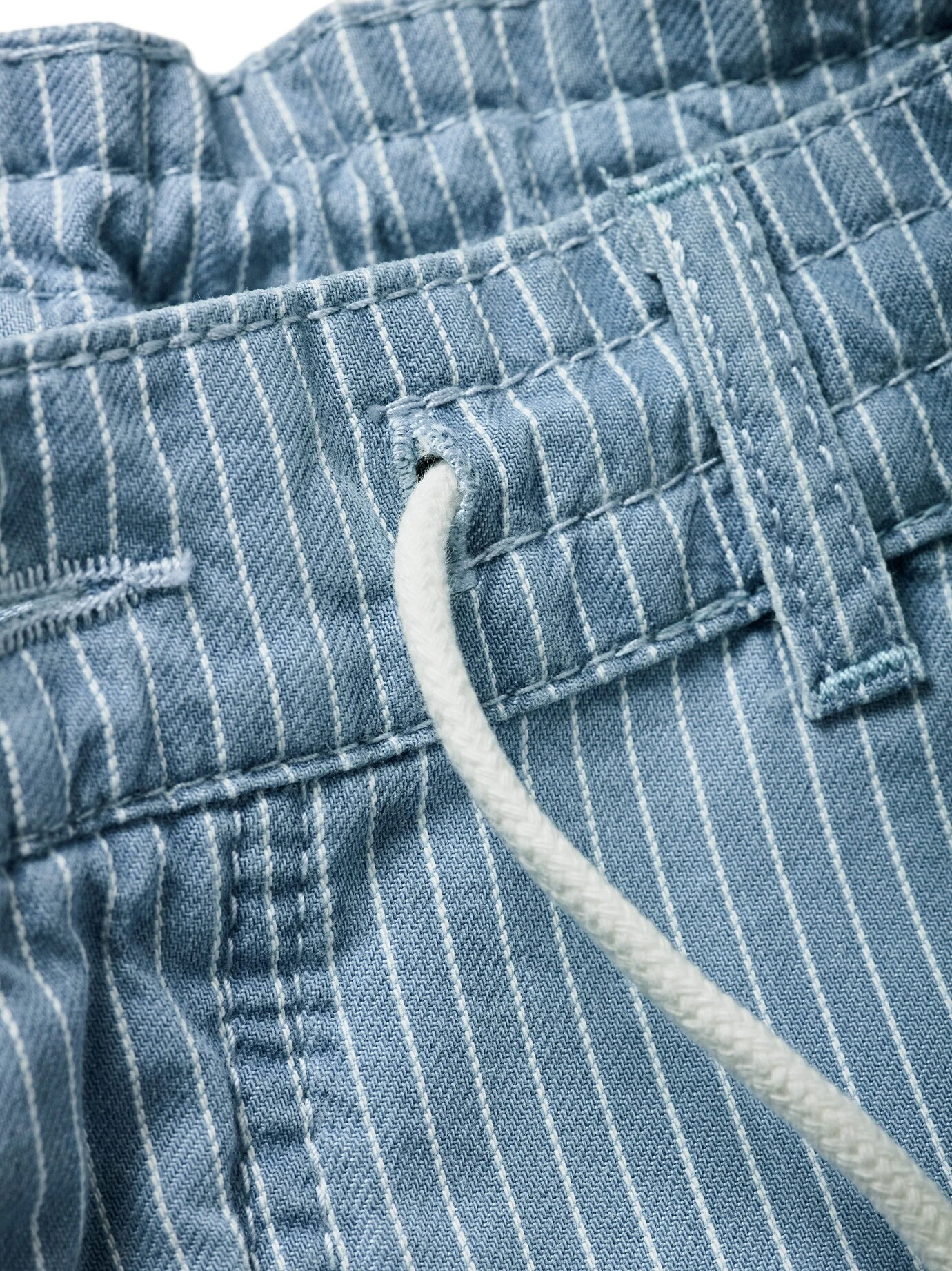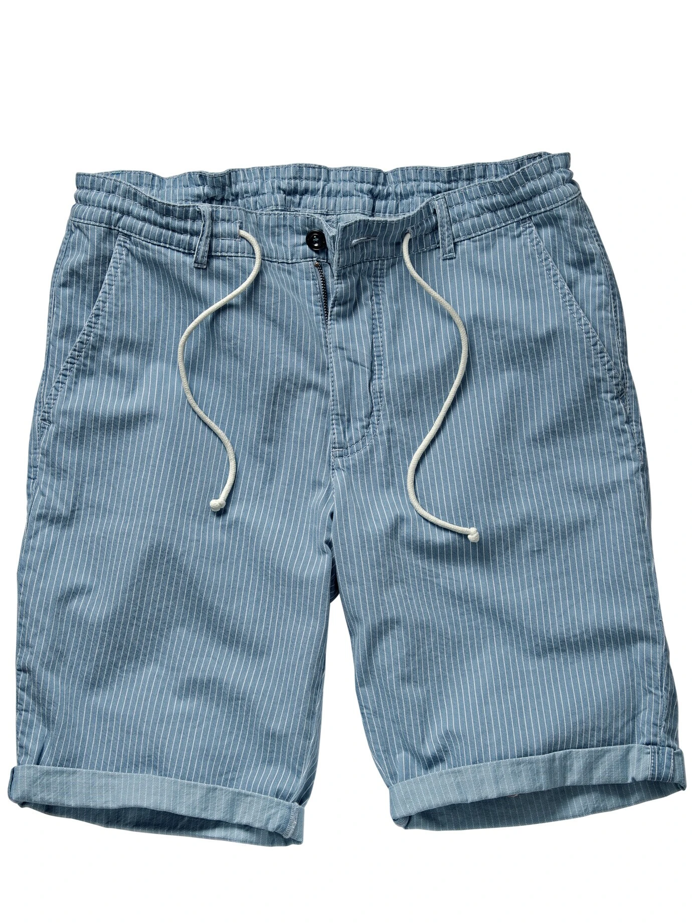 Wer Jeans liebt, braucht im Sommer eine Alternative. Dieser spanische Baumwollstoff ist leicht und traditionell indigogefärbt. Mit dem Tragen entwickelt sich dadurch eine sanfte Used-Optik, ganz individuell im Bereich der Whiskers (die sympathischen Sitzfalten) oder am Hintern. Dazu kommt der Tunnelzug samt Bindeband, der bei Bedarf unterm Gürtel verschwindet. Am liebsten einmal gekrempelt, der Streifen ist filigran genug, dass auch Printshirts dazu hinhauen.