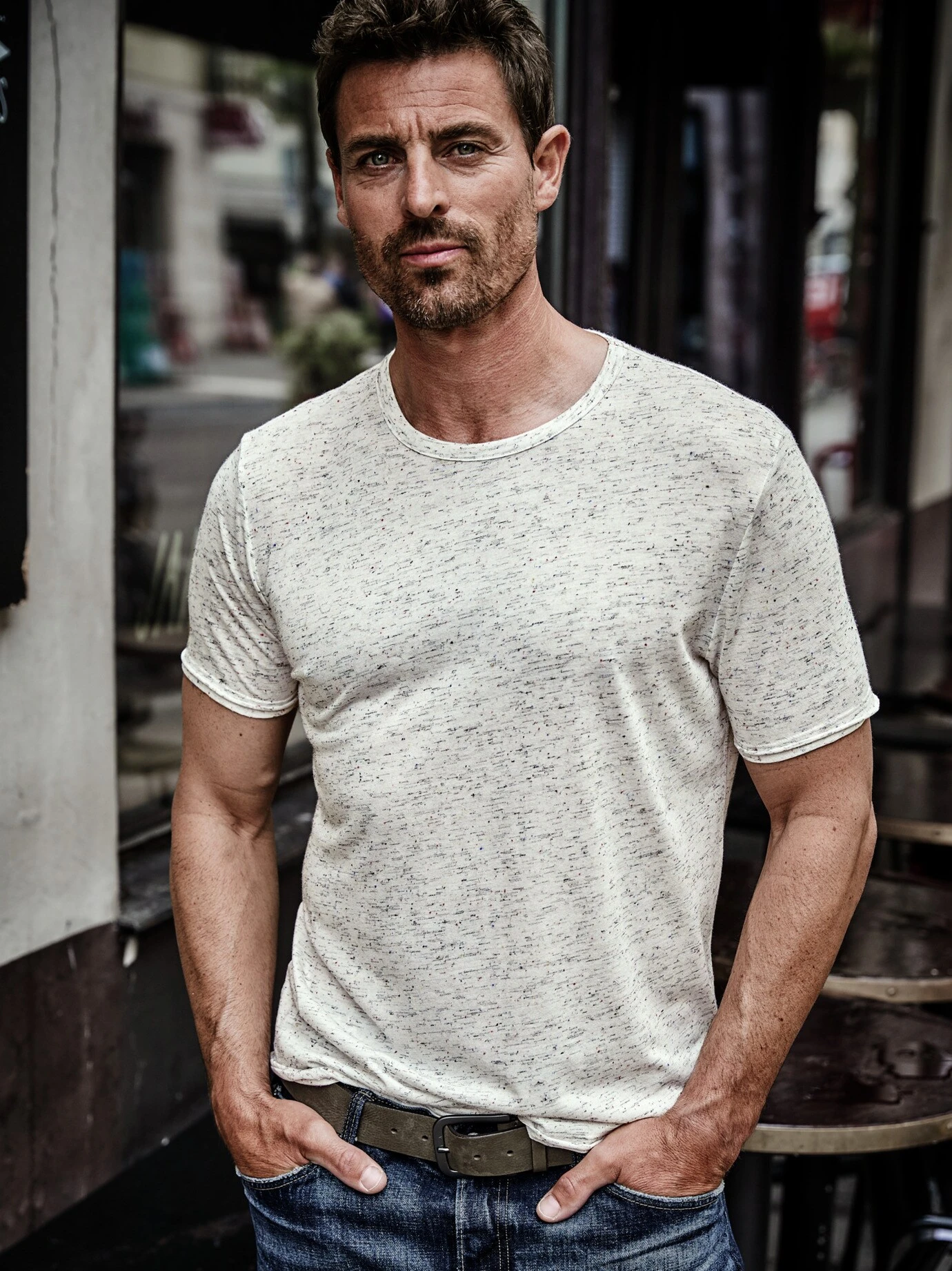 Hierin einer der schreibenden Zunft. Die werkelnde profitiert aber auch vom Shirt, da es geschmeidig anliegt, beinahe seidig. Resultiert aus dem hälftigen Viskoseanteil, der Rest ist strapazierfähige Hightech-Faser. Das Muster ist inspiriert von Zeitungspapier, entsteht tatsächlich aber durchs Garn. Damit passt es sogar zu gemusterten Hosen, am liebsten aber – klar – zur schwarzen Chino oder Blue-Jeans.